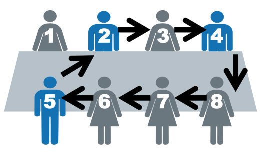 Imagine an office desk setup, where if person A talks to C about something, B and D can still overhear and intercede in the conversation if they have any valuable information